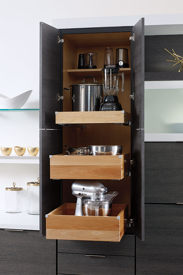 The flexibility to specify any base cabinet enables you to create custom configurations to accommodate this 24" deep wall pantry unit, which is available in a broader range of widths and heights. Shown outfitted with our optional Deep Roll Tray Modification.
